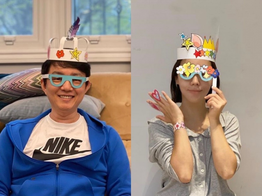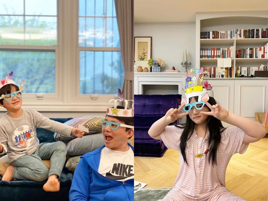 공개된 사진에는 직접 종이로 만든 가면과 왕관을 쓴 부부의 모습과 즐거운 듯 환하게 미소 짓고 있는 '소다 남매' 모습이 담겼다.