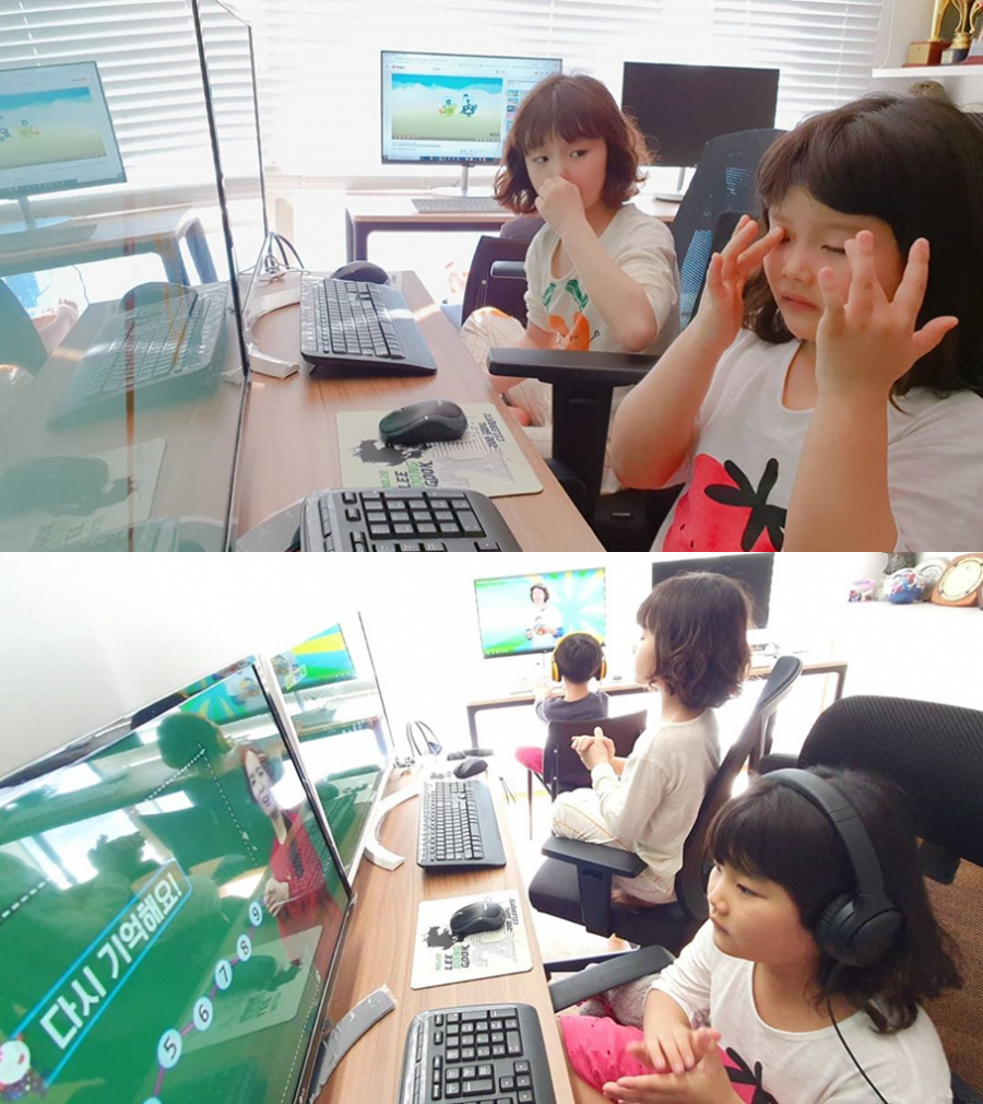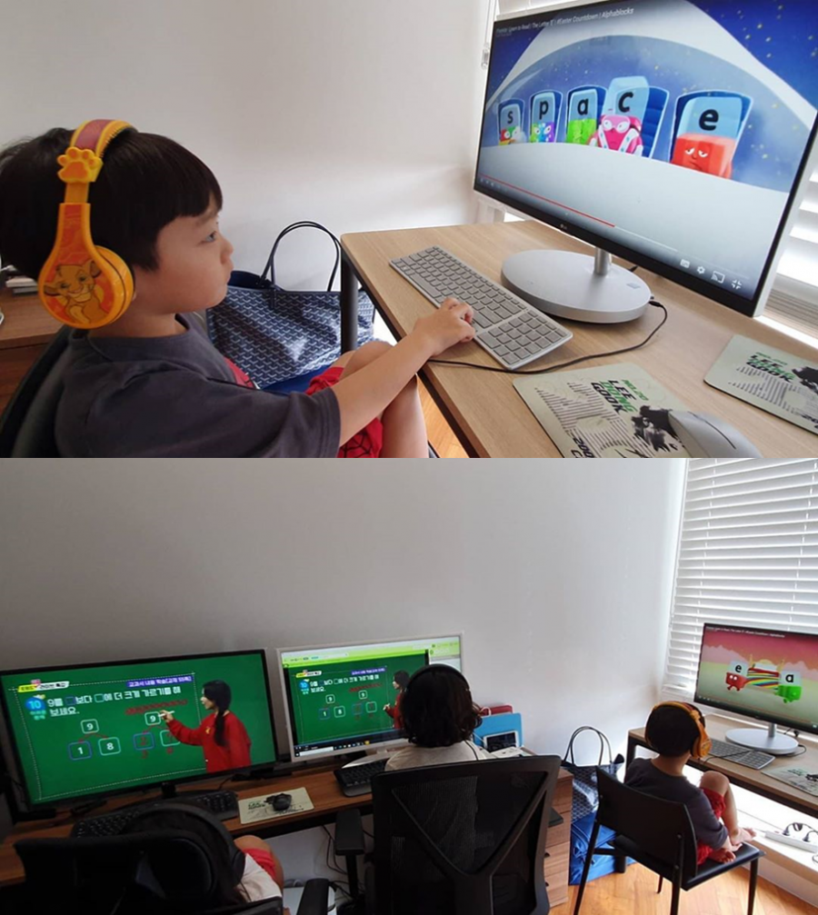 공개된 사진에는 헤드셋을 착용한 채 컴퓨터 앞에 앉아 수업을 듣고 있는 설아 수아 양 모습이 담겼다.