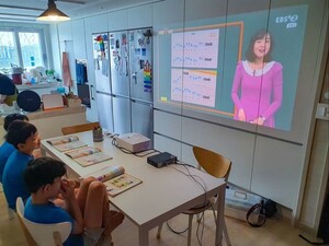 송일국은 20일 자신의 인스타그램에 "오늘부터 1,2학년 온라인 개학. 온라인은 연결 안 되고 TV가 없어서 마침 있던 프로젝터로 연결"했다며 사진을 올렸다.