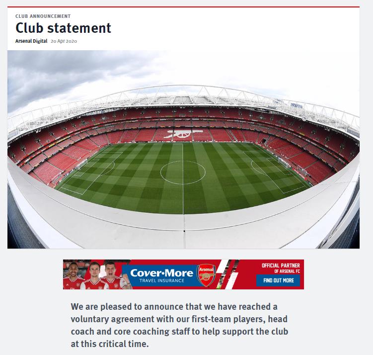 아스널 구단은 21일(한국 시간) 공식 홈페이지를 통해 "코로나19 확산으로 어려운 시기에 1군 선수단, 감독, 핵심 코칭스태프가 자발적인 연봉 삭감에 나섰다"라고 밝혔다.