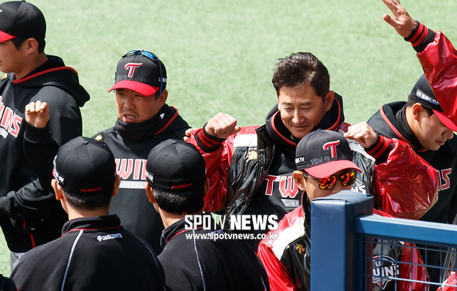 [스포티비뉴스=잠실, 한희재 기자] KBO리그 LG 트윈스와 두산 베어스의 연습경기가 21일 오후 서울 잠실야구장에서 열렸다. 경기전 미팅을 한 LG 정근우와 박용택이 파이팅을 외치고 있다. 코로나19로 팀 간 경기를 하지 못했던 각 구단은 이날 연습경기를 시작했고 KBO는 오는 5월 5일 정규시즌 개막을 발표했다.스포티비뉴스=잠실, 한희재 기자