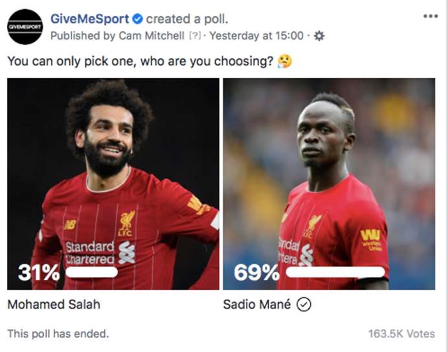약 16만 명이 참여한 설문조사에서 69%에 이르는 응답자가 모하메드 살라(27)보다 마네 가치를 더 높이 평가했다.