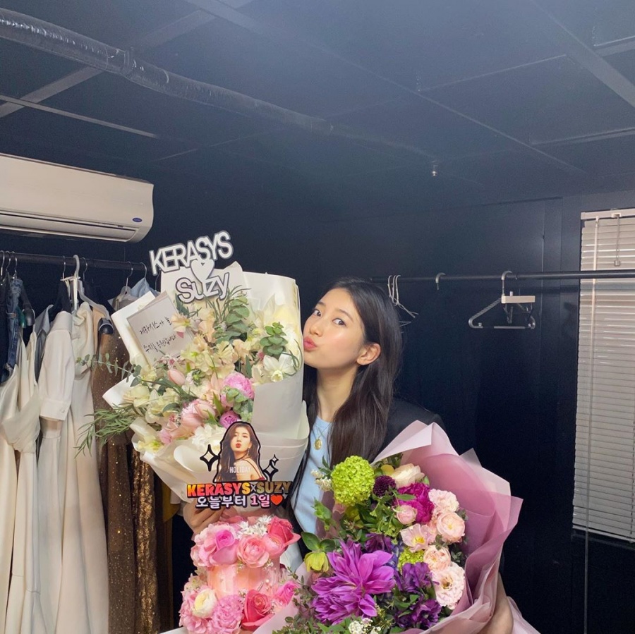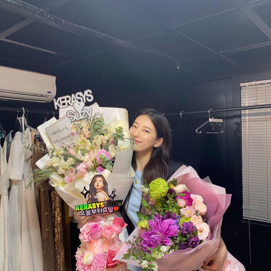 수지가 들고 있는 꽃다발은 모델로 활동 중인 샴푸 브랜드가 선물한 것으로 "오늘부터 1일"이라는 메시지가 적혀 있다.