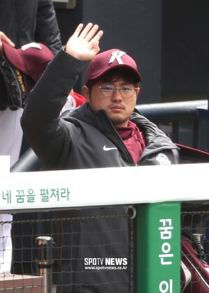 [스포티비뉴스=잠실, 곽혜미 기자] 두산 베어스와 키움 히어로즈의 연습 경기가 22일 오후 서울 송파구 잠실야구장에서 열렸다. 키움 이지영이 두산 선수들을 향해 손을 흔들고 있다.스포티비뉴스=잠실, 곽혜미 기자