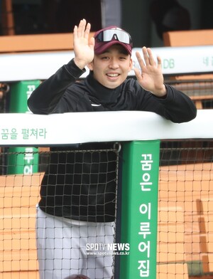 [스포티비뉴스=잠실, 곽혜미 기자] 두산 베어스와 키움 히어로즈의 연습 경기가 22일 오후 서울 송파구 잠실야구장에서 열렸다. 키움 김규민이 두산 선수들을 향해 손을 흔들며 인사를 하고 있다.스포티비뉴스=잠실, 곽혜미 기자