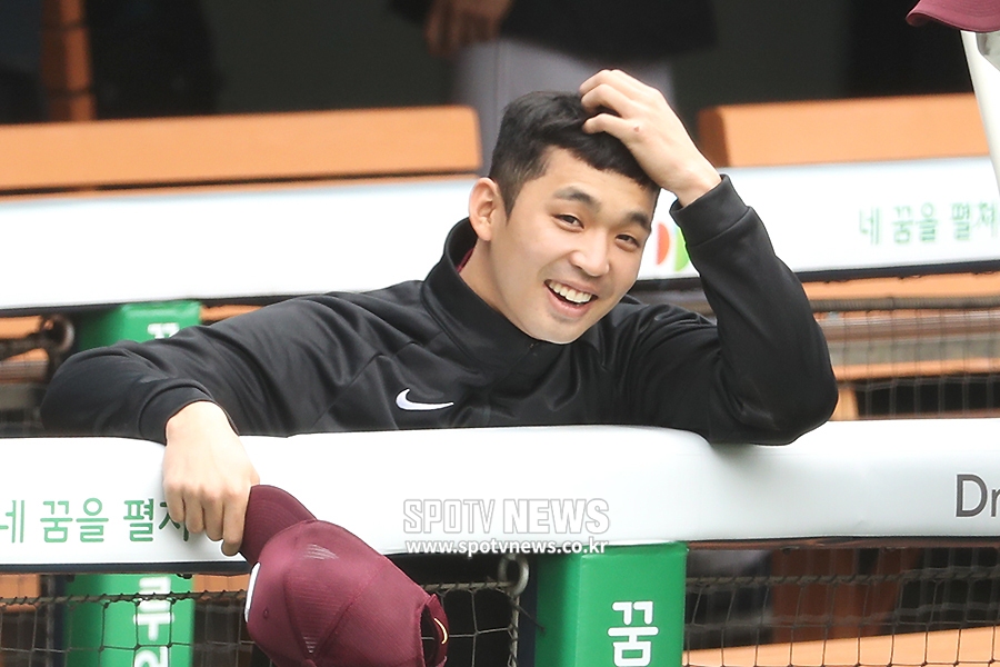 [스포티비뉴스=잠실, 곽혜미 기자] 두산 베어스와 키움 히어로즈의 연습 경기가 22일 오후 서울 송파구 잠실야구장에서 열렸다. 키움 김규민이 머리를 만지고 있다.스포티비뉴스=잠실, 곽혜미 기자
