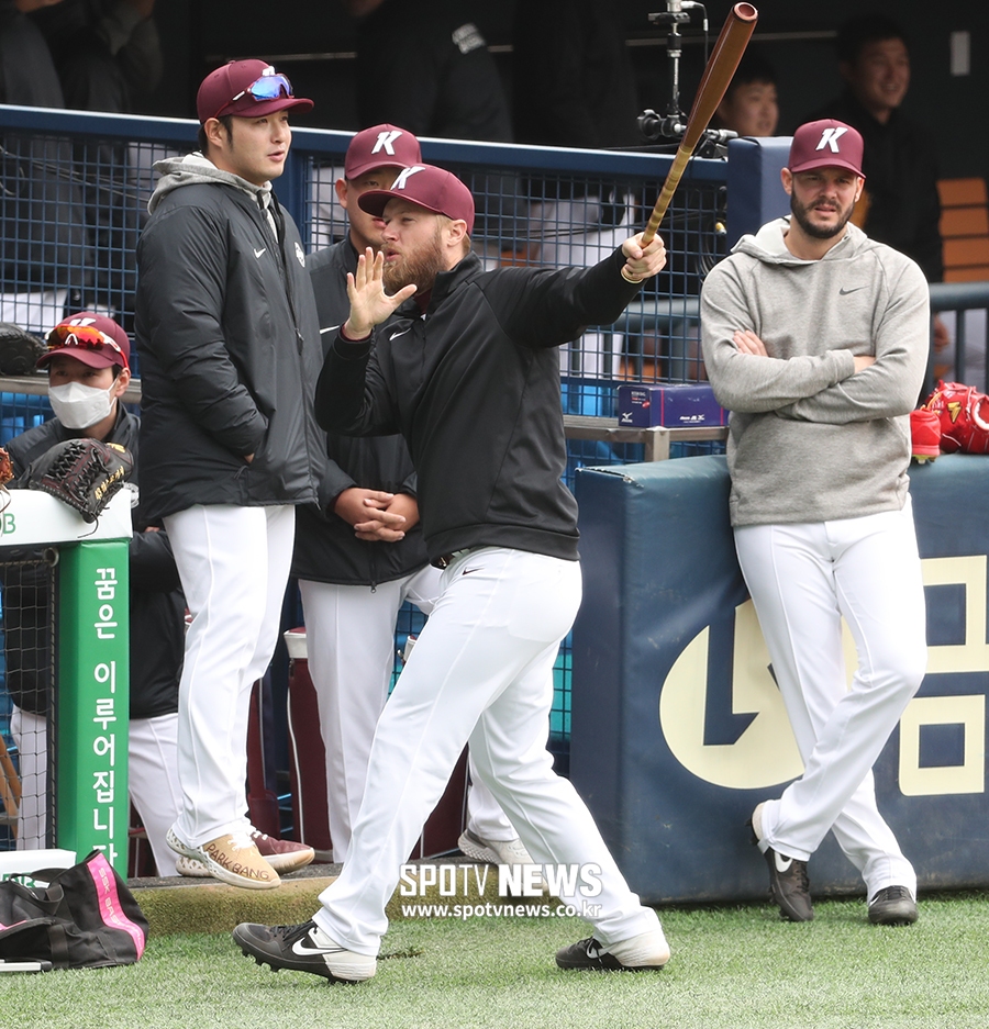 [스포티비뉴스=잠실, 곽혜미 기자] 두산 베어스와 키움 히어로즈의 연습 경기가 22일 오후 서울 송파구 잠실야구장에서 열렸다. 키움 투수 요키시가 배트를 휘두르고 있다.스포티비뉴스=잠실, 곽혜미 기자