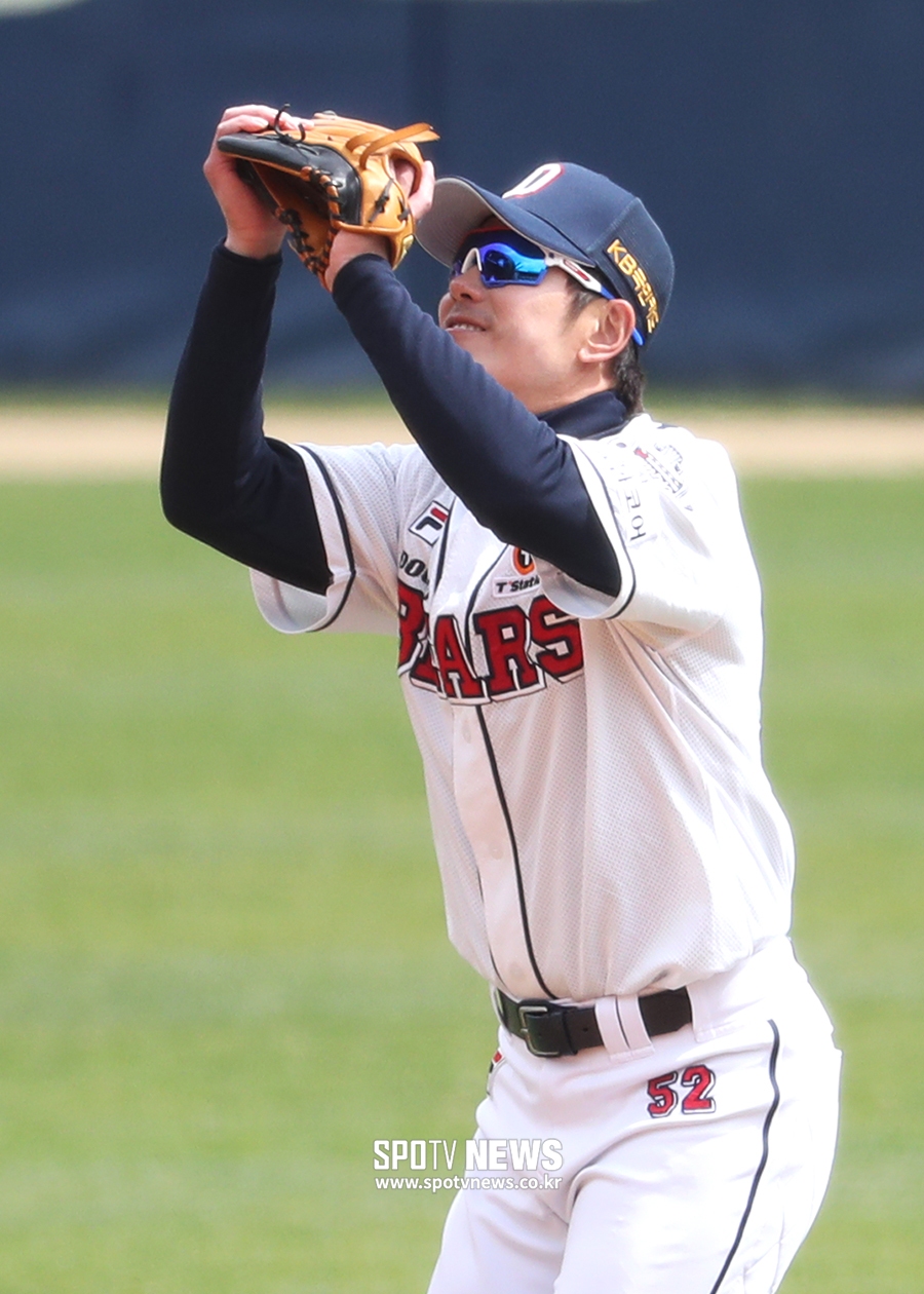 [스포티비뉴스=잠실, 곽혜미 기자] 두산 베어스와 키움 히어로즈의 연습 경기가 22일 오후 서울 송파구 잠실야구장에서 열렸다. 2회초 2사 두산 유격수 김재호가 키움 이택근의 타구를 잡아내고 있다.스포티비뉴스=잠실, 곽혜미 기자