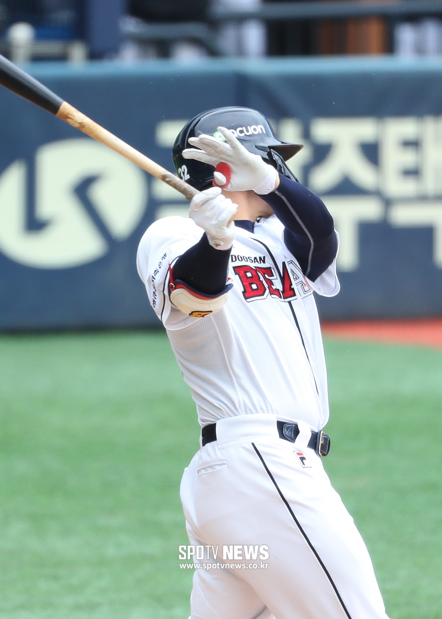 [스포티비뉴스=잠실, 곽혜미 기자] 두산 베어스와 키움 히어로즈의 연습 경기가 22일 오후 서울 송파구 잠실야구장에서 열렸다. 6회말 대타로 나온 두산 김재환이 솔로포를 날리고 있다.스포티비뉴스=잠실, 곽혜미 기자
