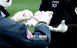 [스포티비뉴스=잠실, 곽혜미 기자] 두산 베어스와 키움 히어로즈의 연습 경기가 22일 오후 서울 송파구 잠실야구장에서 열렸다. 볼보이가 심판에게 위생 장갑을 끼고 볼을 전달하고 있다.스포티비뉴스=잠실, 곽혜미 기자