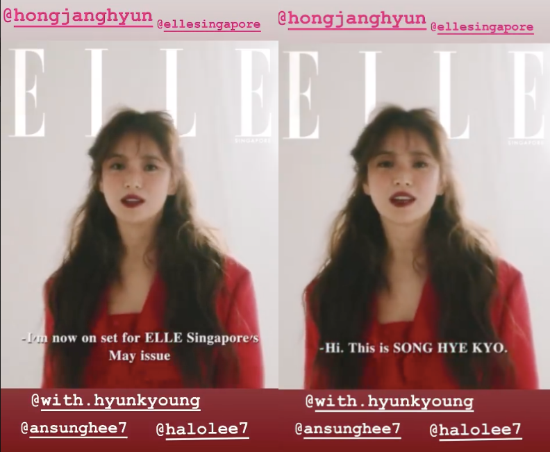 송혜교는 26일 자신의 인스타그램 스토리에 영상 하나를 올렸다. 이는 패션 매거진 '엘르'의 싱가포르판 홍보 영상. 그는 해당 영상에서 "안녕하세요. 송혜교입니다. 저는 지금 '엘르' 싱가포르 5월호를 찍고 있습니다. 많이 기대해주세요"라고 인사를 전했다.