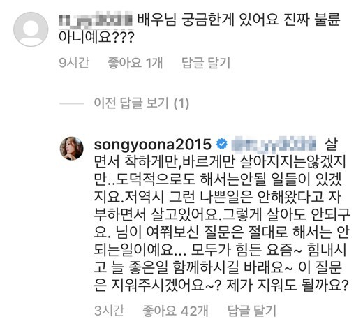 이에 송윤아는 “살면서 착하게만, 바르게만 살아지지는 않겠지만 도덕적으로도 해서는 안 될 일들이 있겠지요. 저 역시 그런 나쁜 일은 안 해왔다고 자부하면서 살고 있어요. 그렇게 살아도 안 되고요”라며 답을 남겼다. 이어 “님이 여쭤보신 질문은 절대로 해서는 안 되는 일이에요”라며, “모두가 힘든 요즘 힘내시고 늘 좋은 일 함께 하시길 바래요”라고 덧붙였다. 그러면서 그는 해당 질문을 지워달라고 정중하게 요청했다.