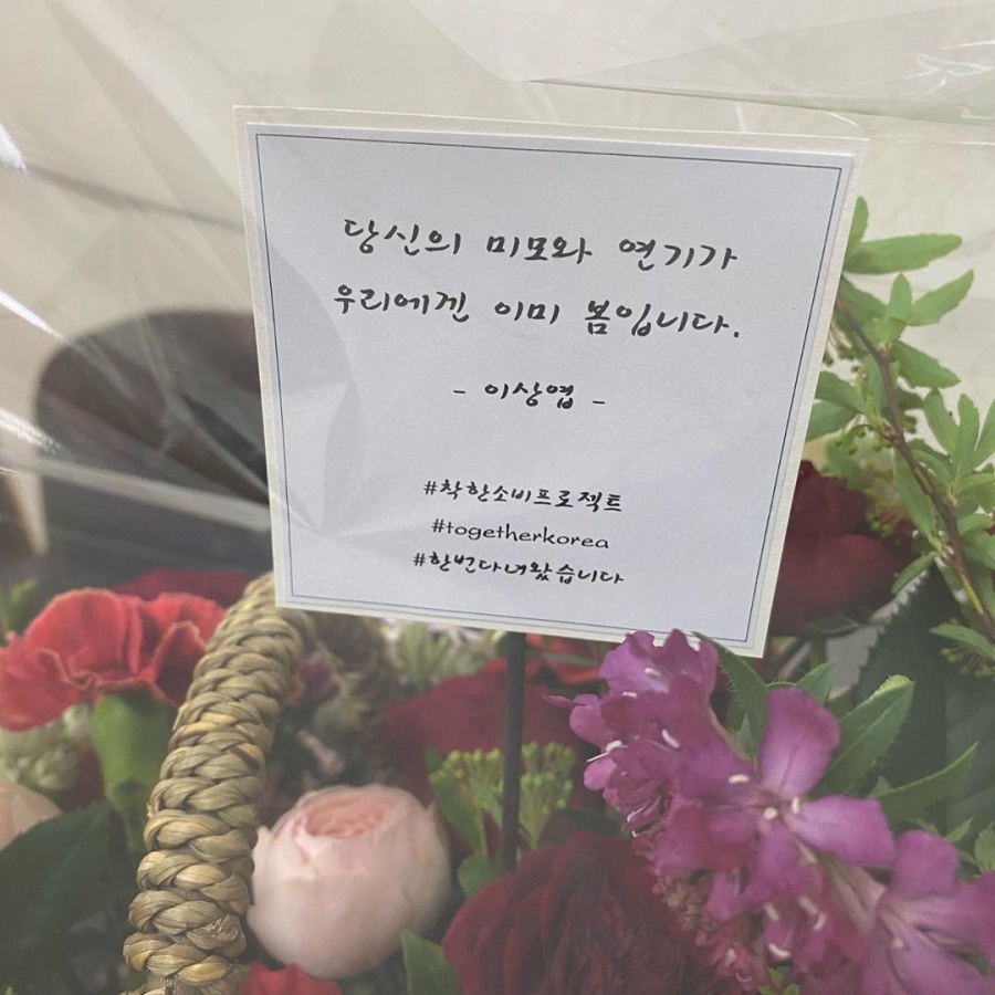 특히 이상엽은 이민정에게 꽃을 주며 "당신의 미모와 연기가 우리에겐 이미 봄입니다"라는 메시지를 적어 누리꾼들의 부러움을 자아냈다.