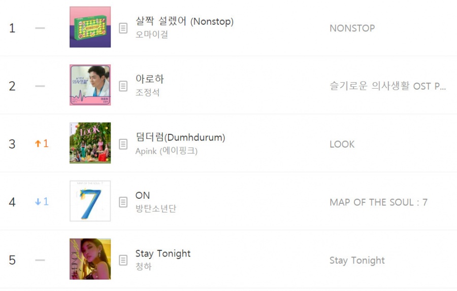 오마이걸의 미니 7집 타이틀곡 '살짝 설렜어'는 27일 오후 6시 발매 이후 멜론 차트 최상위권에 진입, 당일 저녁 9시부터 다음날 오후까지 내내 1위 자리를 지키고 있다.