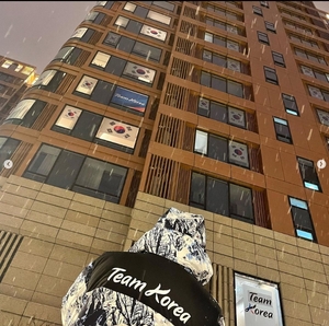 남자 쇼트트랙 국가대표 김동욱(스포츠토토)은 15일 인스타그램에 선수단 숙소 외벽 사진을 올렸다. 한국 선수단이 묵는 곳으로 보이는 가운데 방 창문마다 태극기가 붙어 있어 눈길을 모았다.