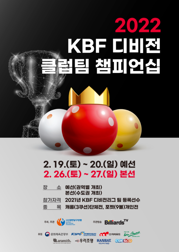 [스포티비뉴스=정형근 기자] 대한당구연맹이 19일부터 ‘2022 KBF 디비전 클럽팀 챔피언십 (이하 클럽팀 챔피언십)’을 개최한다. 이번 대회에서 지난해 디비전 리그에 참여한 팀들을 대상으로 최강팀을 선발한다.