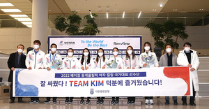 ▲ 팀킴 컬링 선수단 ⓒ곽혜미 기자 [스포티비뉴스=인천국제공항, 곽혜미 기자] 2022 베이징 동계올림픽을 마친 대한민국 대표팀이 21일 오후 인천국제공항을 통해 귀국했다. 컬링 대표팀이 기념 촬영을 하고 있다.