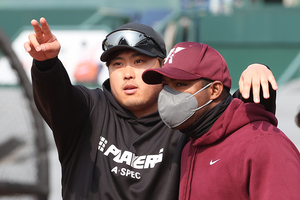 ▲ 류현진 푸이그 ⓒ곽혜미 기자 [스포티비뉴스=대전, 곽혜미 기자] 한화 이글스와 키움 히어로즈의 연습 경기가 4일 오후 대전 한화생명이글스파크에서 열렸다. 토론토 류현진과 키움 푸이그가 인사를 나누고 있다.