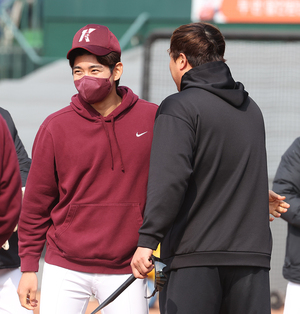 ▲ 이정후 류현진 ⓒ곽혜미 기자 [스포티비뉴스=대전, 곽혜미 기자] 한화 이글스와 키움 히어로즈의 연습 경기가 4일 오후 대전 한화생명이글스파크에서 열렸다. 류현진과 이정후가 인사를 나누고 있다.