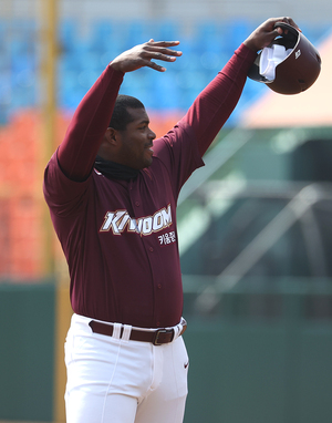 ▲ 푸이그 ⓒ곽혜미 기자 [스포티비뉴스=대전, 곽혜미 기자] 한화 이글스와 키움 히어로즈의 연습 경기가 4일 오후 대전 한화생명이글스파크에서 열렸다. 1회말 2사 1루 상황에서 키움 푸이그가 1루타를 날리고 류현진에게 자랑을 하고 있다.