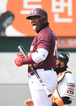 ▲ 푸이그 ⓒ곽혜미 기자 [스포티비뉴스=대전, 곽혜미 기자] 한화 이글스와 키움 히어로즈의 연습 경기가 4일 오후 대전 한화생명이글스파크에서 열렸다. 1회초 2사 1루 상황에서 키움 푸이그가 한화 김이환의 투구의 당황하고 있다.