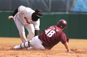 ▲ 박찬혁 ⓒ곽혜미 기자 [스포티비뉴스=대전, 곽혜미 기자] 한화 이글스와 키움 히어로즈의 연습 경기가 4일 오후 대전 한화생명이글스파크에서 열렸다. 5회초 2사 키움 박찬혁이 타구를 날린 후 2루까지 진루를 시도했으나 태그아웃 되고 있다.