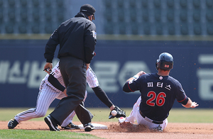 [스포티비뉴스=잠실, 곽혜미 기자] 2022 KBO리그 LG 트윈스와 롯데 자이언츠의 시범경기가 27일 오후 서울 송파구 잠실야구장에서 열렸다. 2회초 2사 1루 롯데 나승엽의 타석 때 1루 주자 피터스가 2루 도루에 성공하고 있다.