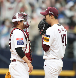 [스포티비뉴스=고척, 곽혜미 기자] 2022 신한은행 SOL KBO리그 키움 히어로즈와 롯데 자이언츠의 경기가 2일 오후 서울 구로구 고척스카이돔에서 열렸다. 5회초 무사 2,3루 상황에서 키움 선발 안우진이 포수 이지영과 대화를 나누고 있다.