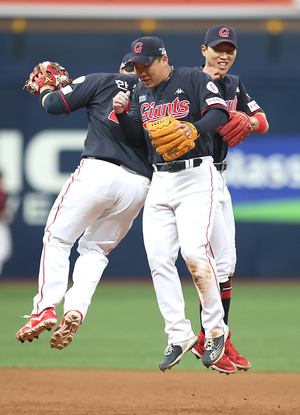[스포티비뉴스=고척, 곽혜미 기자] 2022 신한은행 SOL KBO리그 키움 히어로즈와 롯데 자이언츠의 경기가 2일 오후 서울 구로구 고척스카이돔에서 열렸다. 7-2로 승리한 롯데 한동희, 안치홍, 박승욱이 점핑 세리머니를 하고 있다.