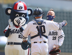 [스포티비뉴스=잠실, 곽혜미 기자] 2022 신한은행 SOL KBO리그 두산 베어스와 한화 이글스의 경기가 3일 오후 서울 송파구 잠실야구장에서 열렸다. 은퇴식을 하는 유희관이 시구를 마친 후 박세혁과 포옹을 하고 있다.