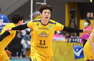▲ 김홍정 ⓒ곽혜미 기자 [스포티비뉴스=의정부, 곽혜미 기자] 도드람 2021-2022 V리그 남자부 KB손해보험과 한국전력의 플레이오프가 3일 오후 경기도 의정부체육관에서 열렸다. 블로킹을 성공한 KB손해보험 김홍정이 세리머니를 하고 있다.