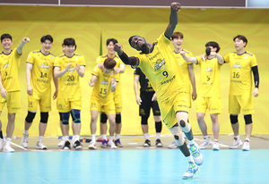 [스포티비뉴스=의정부, 곽혜미 기자] 도드람 2021-2022 V리그 남자부 KB손해보험과 한국전력의 플레이오프가 3일 오후 경기도 의정부체육관에서 열렸다. 득점에 성공한 KB손해보험 케이타가 오토바이 세리머니를 하고 있다.