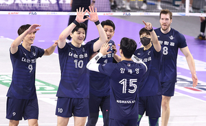 ▲ 대한항공 ⓒ곽혜미 기자 [스포티비뉴스=인천, 곽혜미 기자] 도드람 2021-2022 V리그 남자부 대한항공과 KB손해보험의 챔피언 결정 1차전이 5일 오후 인천 계양체육관에서 열렸다. 득점에 성공한 대한항공 선수들이 기뻐하고 있다.
