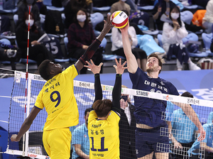 [스포티비뉴스=인천, 곽혜미 기자] 도드람 2021-2022 V리그 남자부 대한항공과 KB손해보험의 챔피언 결정 1차전이 5일 오후 인천 계양체육관에서 열렸다. KB손해보험 케이타와 대한항공 링컨이 볼 다툼을 벌이고 있다.