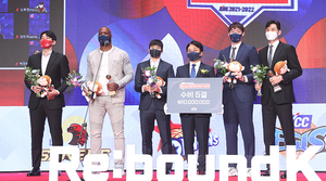[스포티비뉴스=삼성동, 곽혜미 기자] '2021-2022 KGC인삼공사 정관장 프로농구 시상식'이 6일 오후 서울 강남구 삼성동 그랜드 인터컨티넨탈 서울 파르나스에서 열렸다. 수비5걸상을 수상한 차바위, 할로웨이, 정성우, 이승현, 문성곤이 포즈를 취하고 있다.