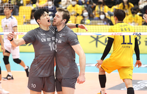 [스포티비뉴스=의정부, 곽혜미 기자] 도드람 2021-2022 V리그 남자부 KB손해보험과 대한항공의 챔피언 결정 2차전이 7일 오후 경기도 의정부체육관에서 열렸다. 득점에 성공한 대한항공 정지석이 링컨과 세리머니를 하고 있다.