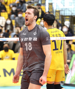 ▲ 링컨 ⓒ곽혜미 기자 [스포티비뉴스=의정부, 곽혜미 기자] 도드람 2021-2022 V리그 남자부 KB손해보험과 대한항공의 챔피언 결정 2차전이 7일 오후 경기도 의정부체육관에서 열렸다. 득점에 성공한 대한항공 링컨이 포효하고 있다.