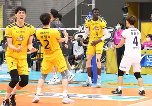 ▲ KB손해보험 ⓒ곽혜미 기자 [스포티비뉴스=의정부, 곽혜미 기자] 도드람 2021-2022 V리그 남자부 KB손해보험과 대한항공의 챔피언 결정 2차전이 7일 오후 경기도 의정부체육관에서 열렸다. 득점에 성공한 KB손해보험 선수들이 기뻐하고 있다.