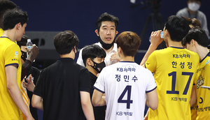 ▲ 후인정 감독 ⓒ곽혜미 기자 [스포티비뉴스=인천, 곽혜미 기자] 도드람 2021-2022 V리그 남자부 대한항공과 KB손해보험의 챔피언 결정 3차전이 9일 오후 인천 계양체육관에서 열렸다. KB손해보험 후인정 감독이 작전 지시를 내리고 있다.