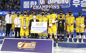 [스포티비뉴스=인천, 곽혜미 기자] 도드람 2021-2022 V리그 남자부 대한항공과 KB손해보험의 챔피언 결정 3차전이 9일 오후 인천 계양체육관에서 열렸다. 준우승을 거둔 KB손해보험 선수들이 기념 촬영을 하고 있다.