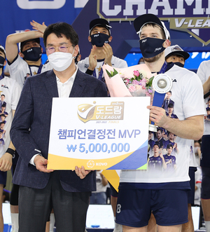 [스포티비뉴스=인천, 곽혜미 기자] 도드람 2021-2022 V리그 남자부 대한항공과 KB손해보험의 챔피언 결정 3차전이 9일 오후 인천 계양체육관에서 열렸다. 챔피언 결정전 MVP에 선정된 대한항공 링컨이 기념 촬영을 하고 있다.