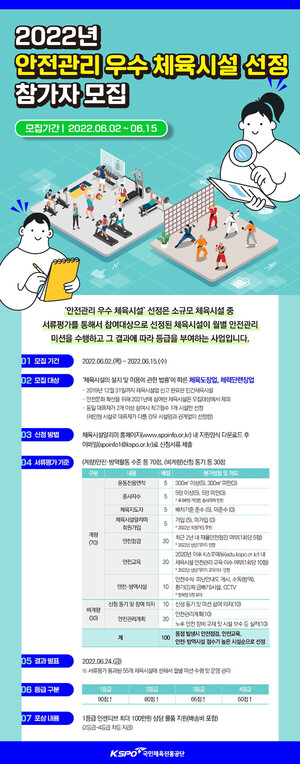[스포티비뉴스=정형근 기자] 국민체육진흥공단이 안전관리 우수 체육시설 선정을 위한 참여업체를 모집한다고 밝혔다.