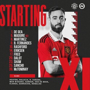 크리스티안 에릭센은 선발 출격한다. 제이든 산초, 마커스 래시포드가 공격에 나선다. 브루노 페르난데스, 프레드, 스콧 맥토미니가 중원에서 돕는다. 루크 쇼, 해리 매과이어, 리산드로 마르티네스, 디오고 달롯이 포백을 구성한다. 골키퍼 장갑은 데 헤아가 낀다.