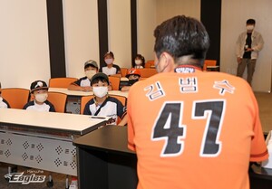 한화 이글스는 4일 대전 한화생명이글스파크에서 열린 NC 다이노스와 홈경기에 ‘키즈데이’ 이벤트를 열었다. 사전 선발된 어린이 회원 20명은 ‘1일 스포츠 기자’가 되어 김범수와 인터뷰를 진행했다. 김범수는 어린이 팬들의 질문에 귀를 기울이며 성심껏 답변을 이어갔다.