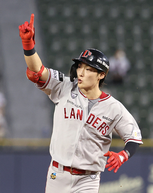 [스포티비뉴스=잠실, 곽혜미 기자] 2022 신한은행 SOL KBO리그 LG 트윈스와 SSG 랜더스의 경기가 6일 오후 서울 송파구 잠실야구장에서 열렸다. 3회초 1사 1루 상황에서 SSG 최지훈이 투런포를 날리고 세리머니를 하고 있다.
