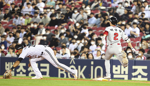 [스포티비뉴스=잠실, 곽혜미 기자] 2022 신한은행 SOL KBO리그 LG 트윈스와 SSG 랜더스의 경기가 6일 오후 서울 송파구 잠실야구장에서 열렸다. 4회초 무사 1루 상황에서 희생번트를 시도한 SSG 박성한이 투수 송구 실책을 틈 타 1루 베이스를 밟고 있다.