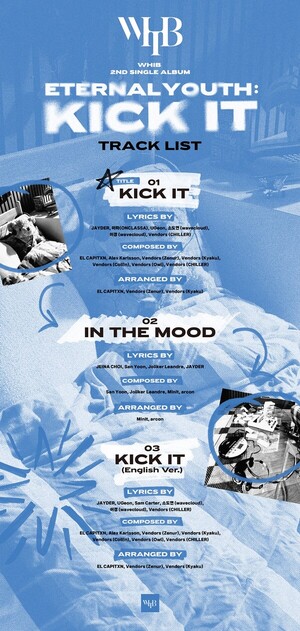 휘브 두번째 싱글에는 타이틀곡 ‘킥 잇'을 비롯해 '인 더 무드' '킥 잇' 영어 버전까지 모두 3곡이 수록된다. 공개된 이미지는 푸른 색감의 배경과 장난스러운 낙서로 ‘영원한 청춘’을 모티브로 한 음반의 정체성을 드러낸다.