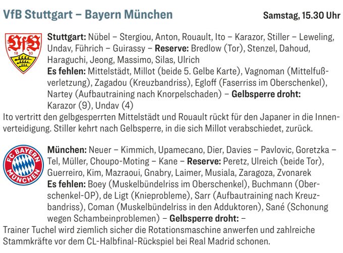 리그 순위는 크게 상관이 없다. 이미 우승은 바이어 04 레버쿠젠의 몫이 됐다. 바이에른 뮌헨은 슈투트가르트전을 통해 유럽축구연맹(UEFA) 챔피언스리그를 대비할 필요가 있다. 주중 홈에서 치른 레알 마드리드와 4강 1차전에서 2-2로 비긴 터라 다음 주 예정된 원정 경기에서 이기려면 전략적인 접근이 필요하다.