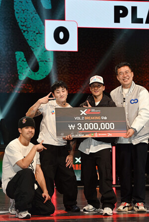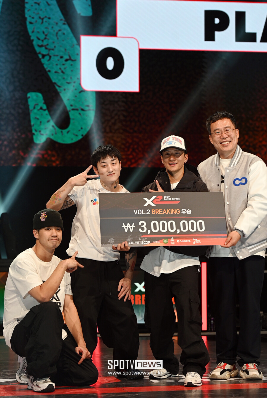 [스포티비뉴스=박성기 기자] 서울 송파구 롯데월드에 위치한 '비타500콜로세움'에서 열린 'X2 : SOOP 댄스 배틀 VOL.2'에서 브레이킹' 부문 우승을 차지한 'Shortyforce / Zootyzoot / Siri'팀이 서수길 SOOP CBO와 함께 포즈를 취하고 있다.