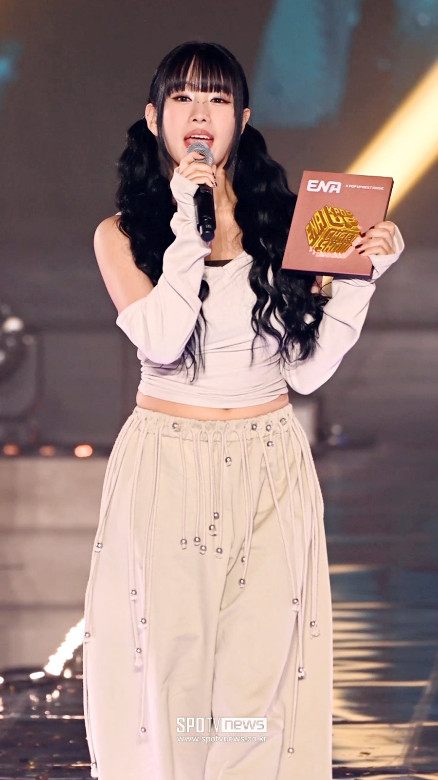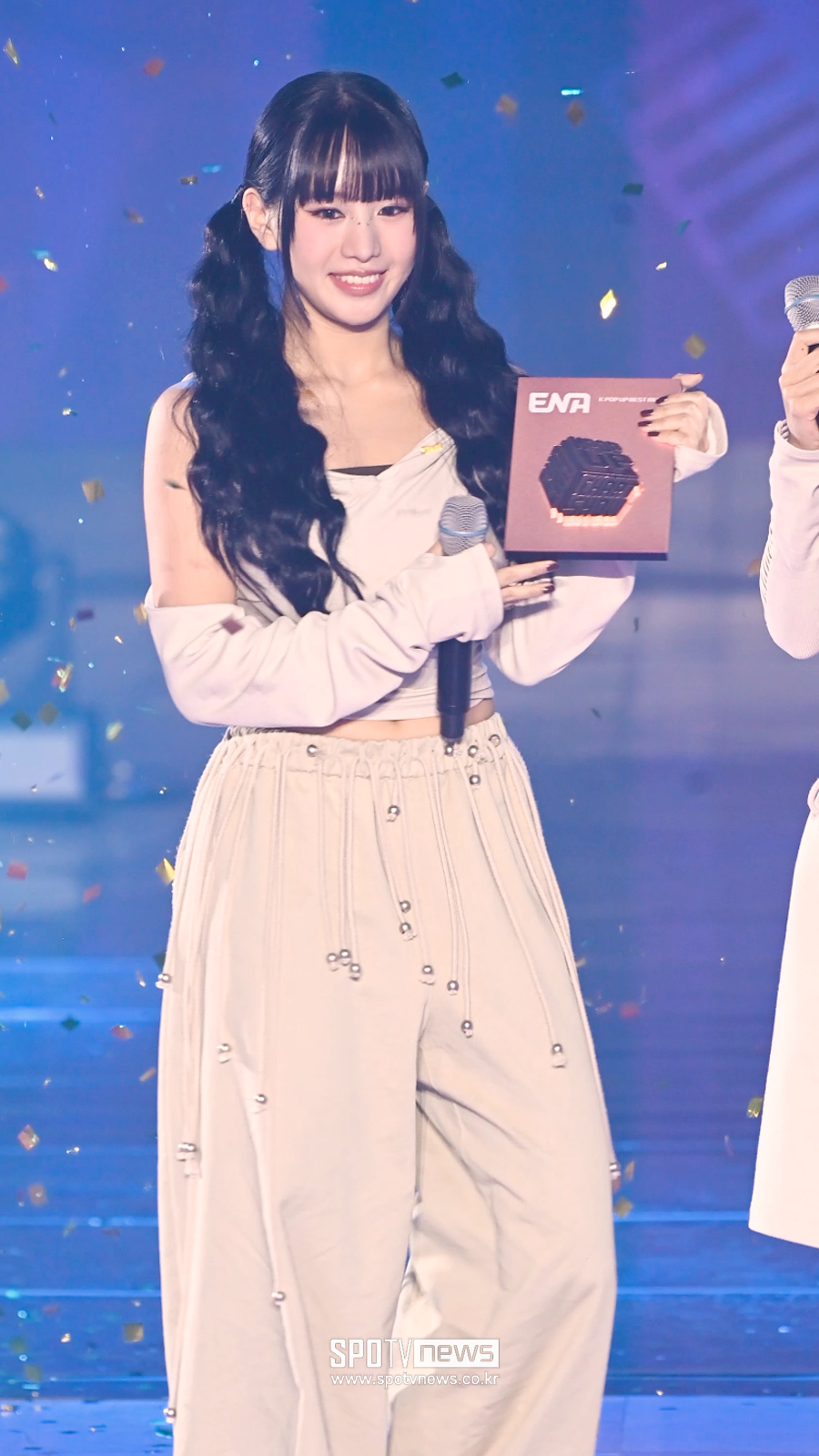 [스포티비뉴스=박성기 기자] 그룹 키스오브라이프 나띠가 15일 오후 6시 30분 방송된 ENA 월간 음악 예능 'ENA 케이팝업 차트쇼'에서 'ENA 케이팝업 베스트 뮤직'을 수상한 후 트로피를 들어 보이고 있다.